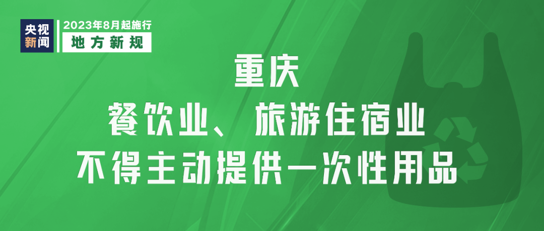《重慶市一次性用品目錄清單管理辦法》8月1日起實施,要求重慶市餐飲業、旅游住宿業不得主動提供一次性用品,鼓勵使用易降解、可回收再利用的綠色環保產品。外賣平臺應積極引導消費者減少使用一次性用品。