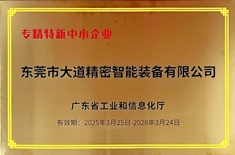 2024年12月19日,大道精密已被評(píng)定為廣東省“專(zhuān)精特新”中小企業(yè)。該資質(zhì)認(rèn)定聚焦于具備“專(zhuān)業(yè)化、精細(xì)化、特色化、新穎化”特征的中小企業(yè),是對(duì)企業(yè)在細(xì)分市場(chǎng)技術(shù)優(yōu)勢(shì)、創(chuàng)新能力及發(fā)展?jié)摿Φ臋?quán)威背書(shū)。大道精密長(zhǎng)期深耕精密智能裝備研發(fā),在自動(dòng)化控制、安全防護(hù)系統(tǒng)集成等領(lǐng)域形成多項(xiàng)核心技術(shù),產(chǎn)品廣泛應(yīng)用于新能源、汽車(chē)制造、精密電子等行業(yè),以高可靠性和智能化水平贏得市場(chǎng)口碑。